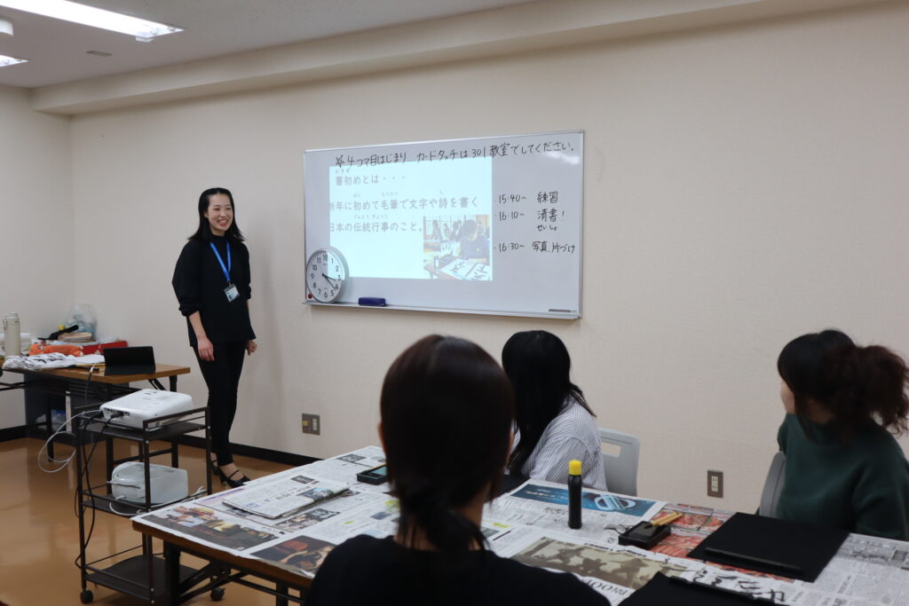 はじめに、先生から「書き初めとは何か」について説明があり、動画を見ながら日本文化としての意味や背景を学びました。