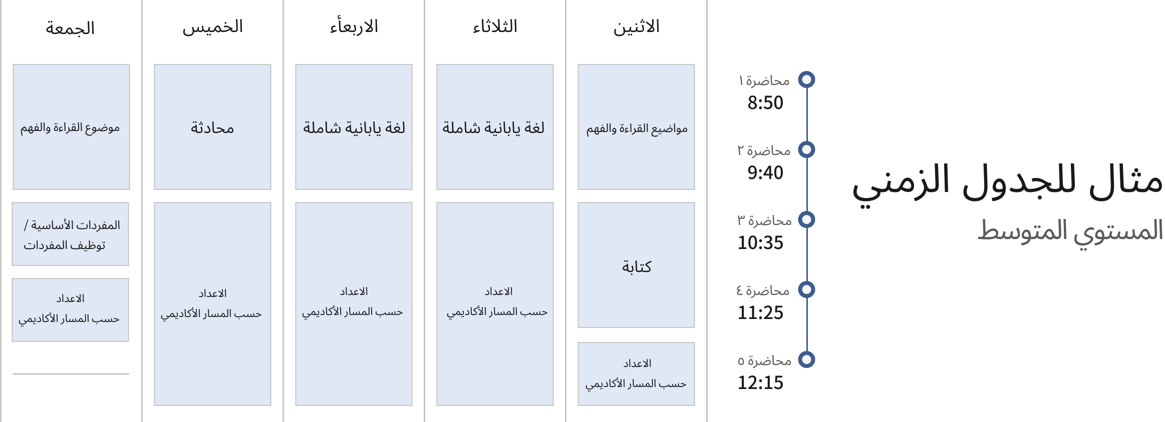 *بالإضافة لدراسة اللغة اليابانية ستدرس أيضًا دروسًا في المواد الأساسية (الرياضيات ومواد العلوم والمواد العامة الادبية) اللازمة لدخول الجامعة