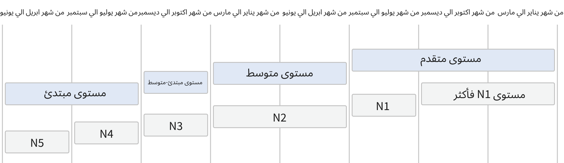 - مستوى A1 إلى A2 حسب “إطار مرجعية تعليم اللغة اليابانية”.
