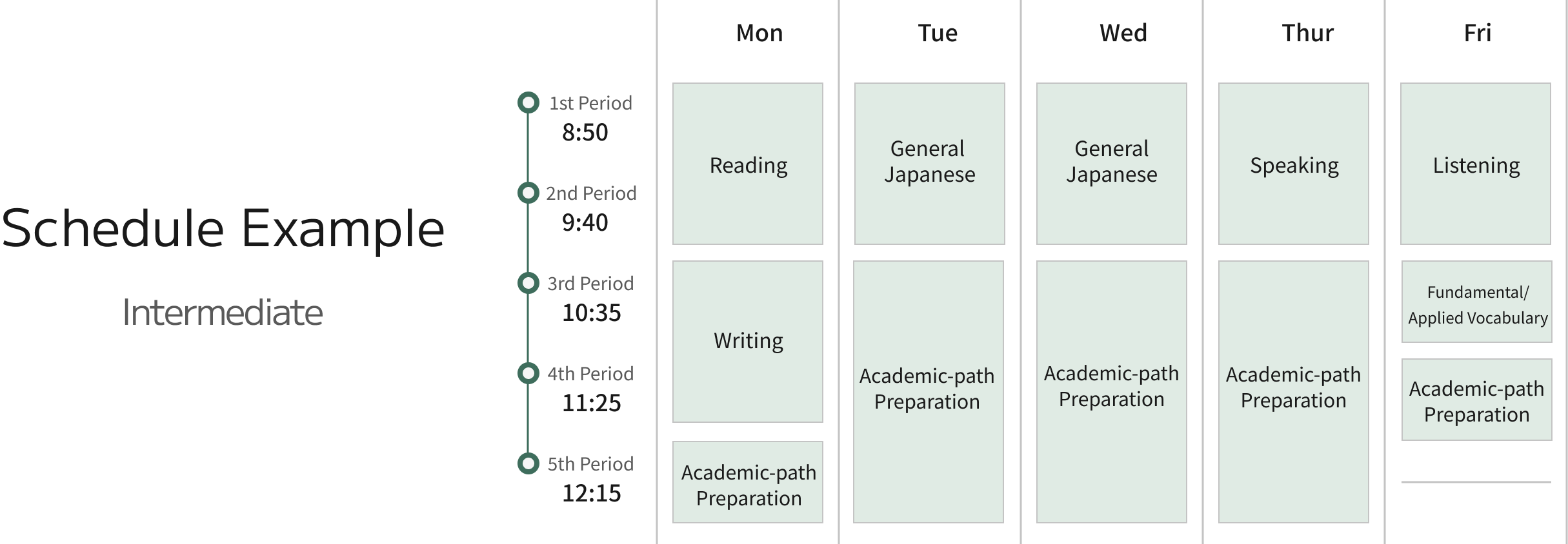 Students will acquire the Japanese language skills necessary to enter a Japanese university or vocational school in Japanese. Students will learn the operational, expressive, and logical thinking skills necessary to actively participate in classes at their school of higher education.