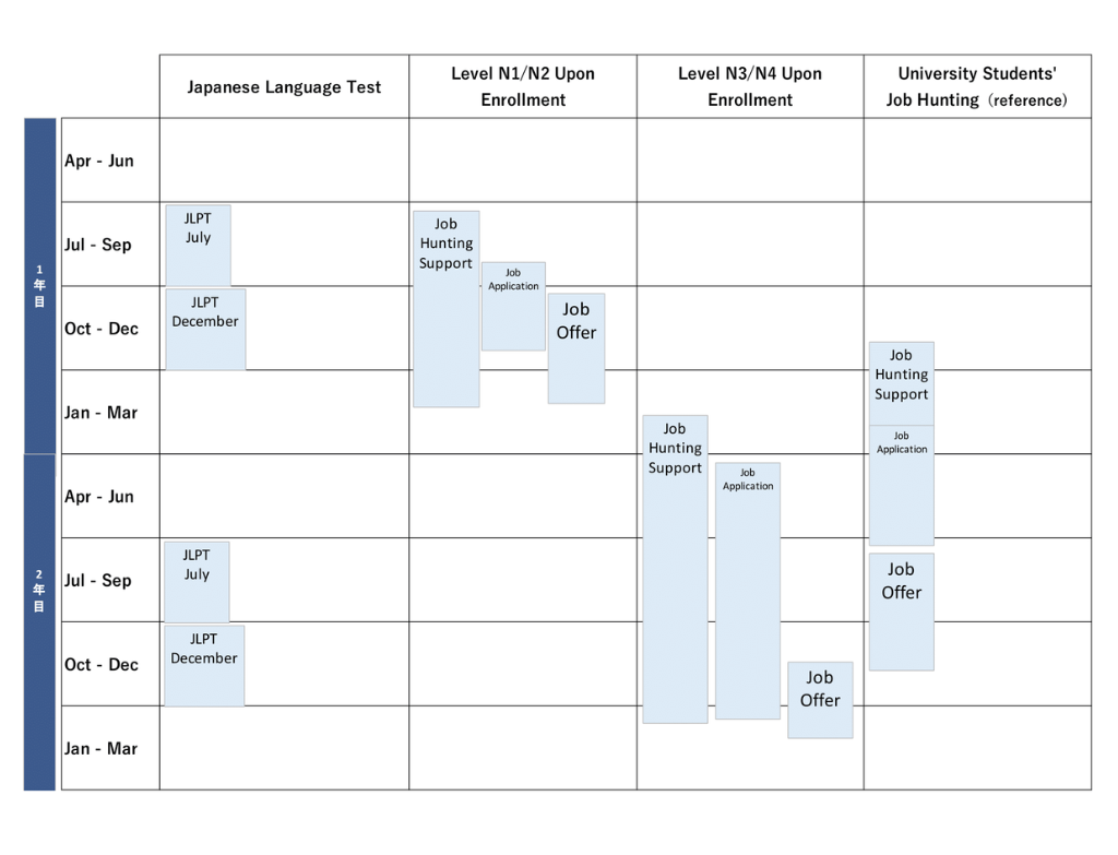 When applying for a job at a Japanese company, it is also essential to have passed Japanese-Language Proficiency Test. To help students pass the required JLPT, exercises will be given throughout the class, and experienced instructors will explain key points. We then help students to pass the test using a “Vocabulary Test Schedule” created based on the student’s ability and the test schedule.