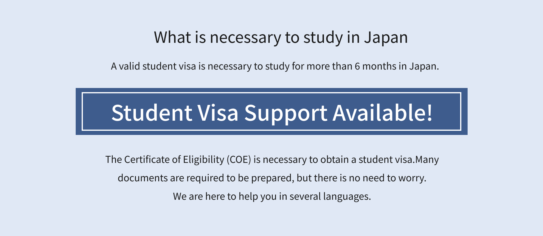 We will explain step-by-step the documents and the application process necessary to get a visa. The tuition fees should be paid after the Certificate of Eligibility (COE) has been issued. After that, we will send you the Certificate of Eligibility (COE). Please take your passport and other necessary documents to the Embassy/Consulate in your country to acquire the visa.