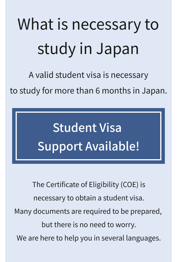 From pre-enrollment to graduation, we provide a variety of support for language, daily life, health, career paths so that you can have a safe school life as a foreign student in Japan.