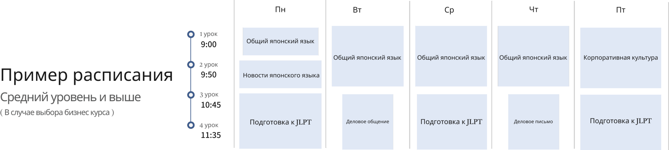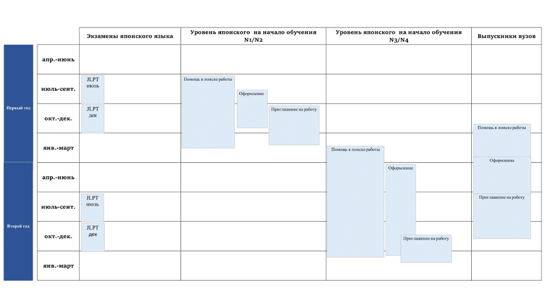 Для приема на работу в японскую компанию также важно сдать тест на знание японского языка JLPT. Чтобы помочь студентам сдать тест, на протяжении всех занятий выполняются необходимые упражнения, а опытные преподаватели объясняют ключевые моменты. При прохождении теста студентам помогает ”график тестирования лексики”, который составляется с учетом способностей студентов.