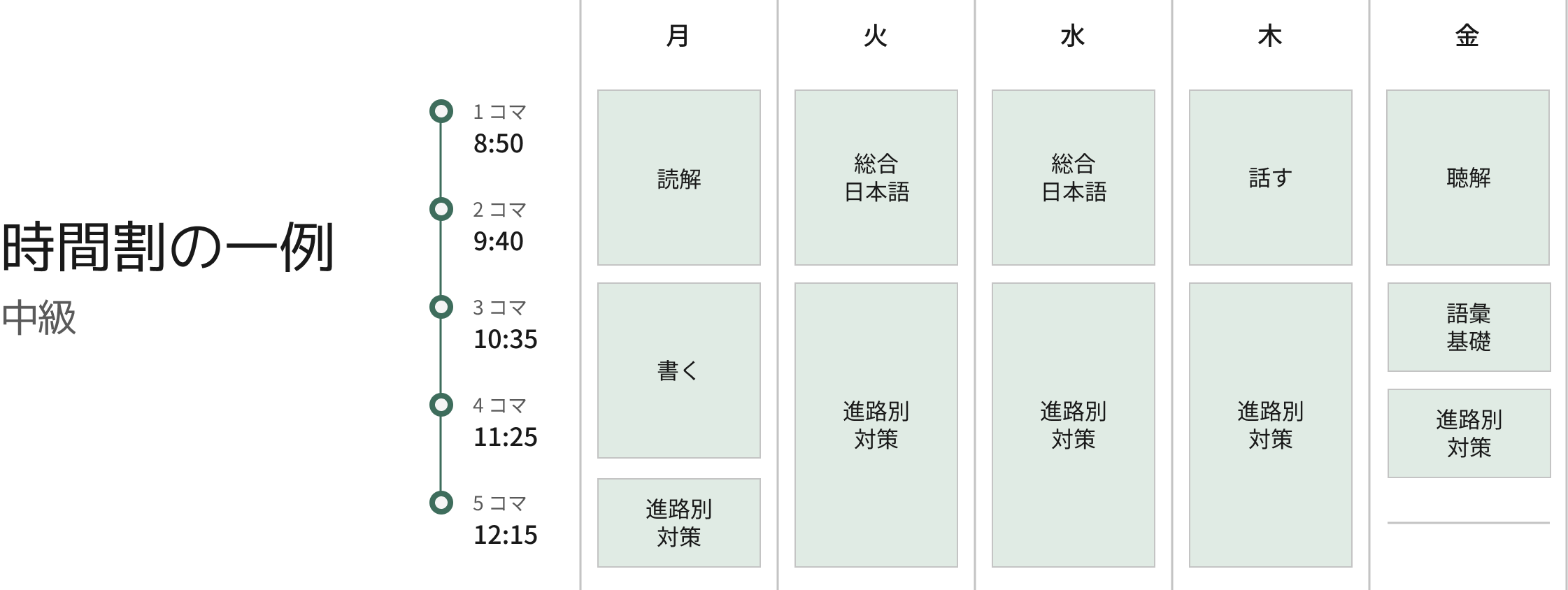 日本語レベルに応じたクラスが設定されており、自分に合ったクラスで、志望校の合格に必要なN2、N1の 取得を目指します。