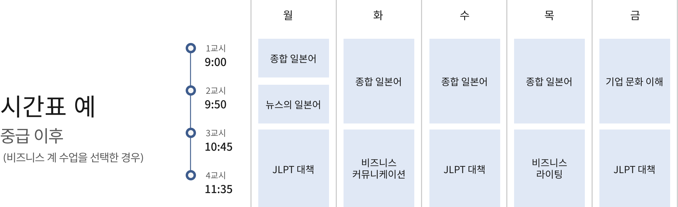 쇼핑을 하거나 친구를 식사에 초대하거나 하는 등 일상생활을 하는데 필요한 회화능력을 키웁니다. 또한 취미나 장래의 꿈, 모국의 문화 소개 등, 국제 교류에 자주 나오는 토픽을 수업에서 다루어, 일본어로 자신을 표현할 수 있는 힘을 기릅니다.