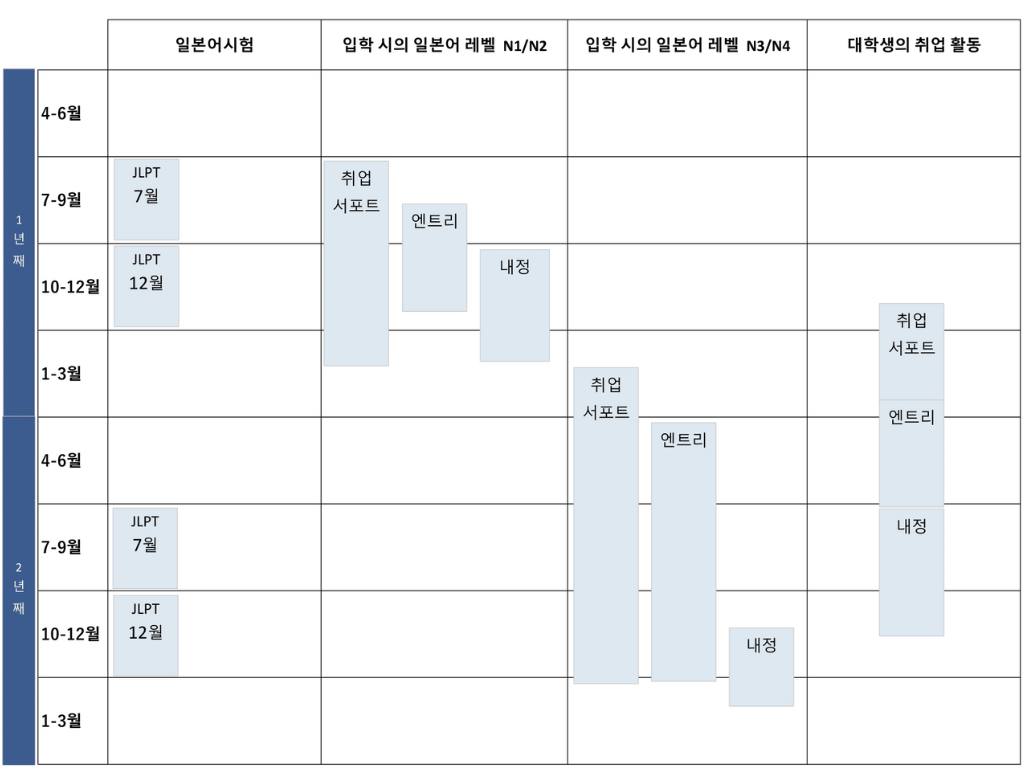 일본 기업에 취업할 때는 일본어 능력시험에 합격하는 것도 중요합니다. 필요한 일본어 시험에 합격할 수 있도록, 수업을 통해 연습을 하고, 경험이 풍부한 강사가 포인트를 설명합니다. 그리고 학생의 능력과 시험 일정을 바탕으로 작성된 ‘어휘 테스트 스케줄’을 사용하여 시험합격을 도와줍니다.