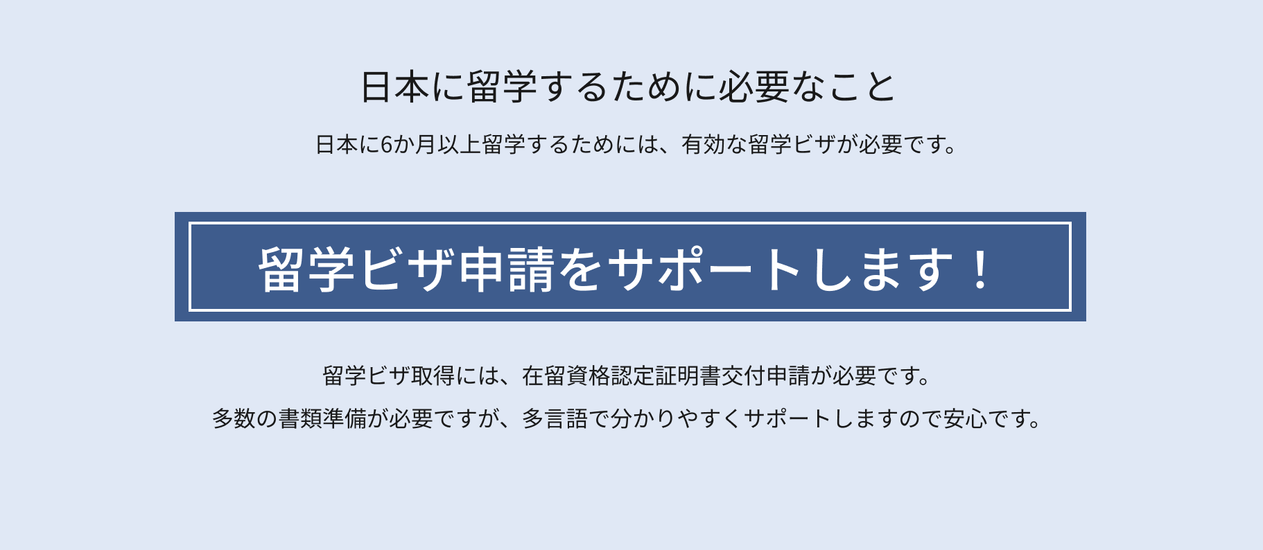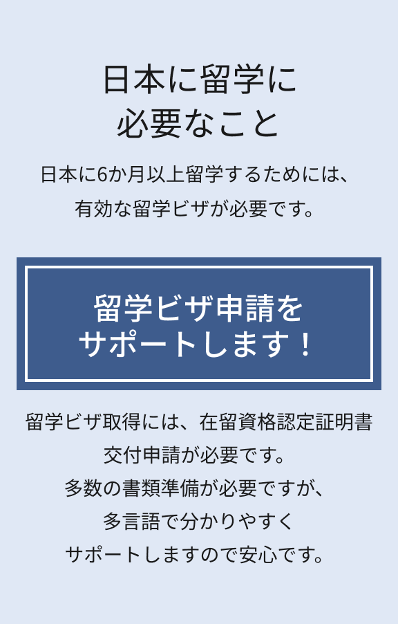 ステップバイステップでビザ取得に必要な書類の準備や申請手続きを丁寧に分かりやすくご案内します。在留資格認定証明書が交付されたら、学費を納付いただきます。その後、在留資格認定証明書をお送りします。パスポートと他の必要書類を持って、自国の日本大使館・領事館でビザを取得ください。