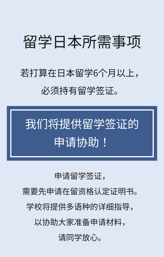 为确保大家在日本安心的度过留学生活,从入学到毕业的整个过程中,学校会从语言、生活、健康、未来规划等各个方面提供帮助与支援。