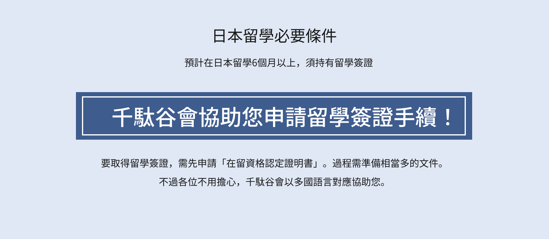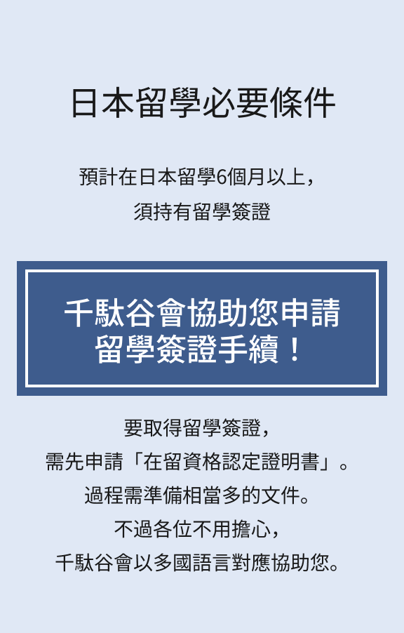 一步一步細心且易懂的引導同學準備各項必要文件與申請手續。在留資格認定證明書核發後,須完成學費繳納。接著會將在留資格認定證明書(電子版)發送給您。請同學帶著護照及其他必要文件至當地日本大使館・領事館等辦理簽證申請手續。