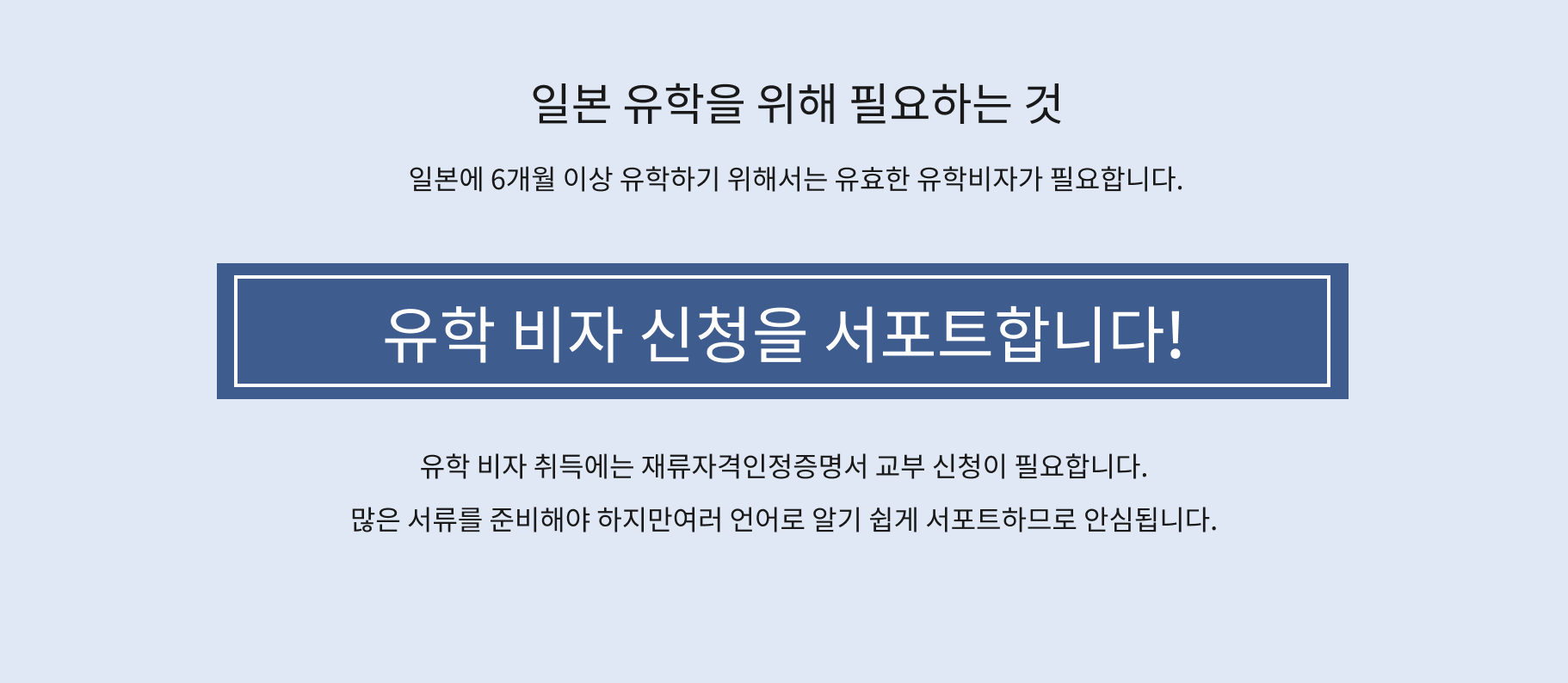 입학 전부터 졸업까지 여러분이 일본에서 안심해서 유학생활을 보낼 수 있게 언어,생활,건강,진로 등 여러 면에서 지원하겠습니다.