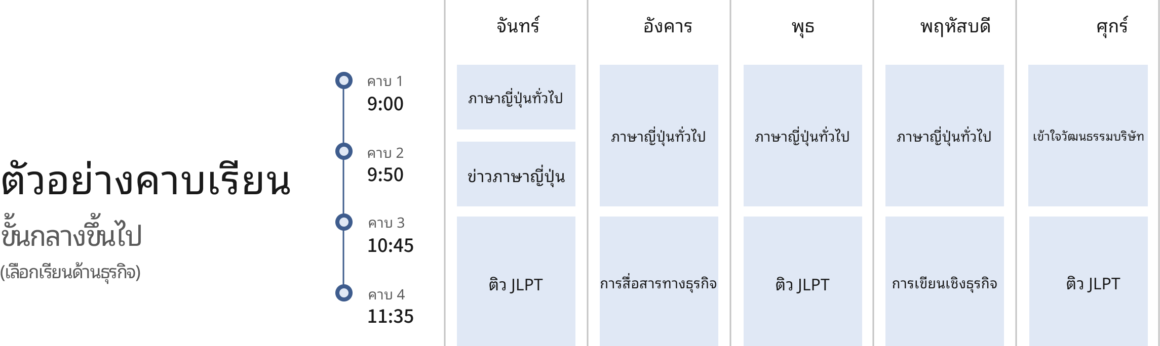 มีเป้าหมายเพื่อให้สามารถใช้ภาษาญี่ปุ่นที่จำเป็นต่อการทำงานเช่น “ประโยคขอร้องในที่ทำงาน” “การนัดหมาย” “การเขียนอีเมลธุรกิจ” อื่น ๆ อีกทั้งยังได้เรียนรู้และเข้าใจเกี่ยวกับวัฒนธรรมการทำงานในองค์กรญี่ปุ่นได้อย่างลึกซึ้ง