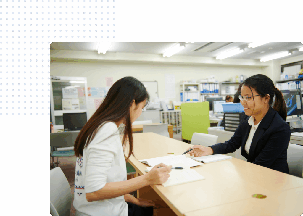 千駄谷的多國籍職員不只在入學前、在校期間提供各種協助,甚至在升大學、研究所、專門學校畢業後的就職,也提供多國語言的服務!為了讓同學能在日本安心度過留學生活,千駄谷職員提供包括語言、生活、健康、畢業後的未來目標、人生方向等的諮詢,用心傾聽每位同學的心聲,適時給予支持和幫助。