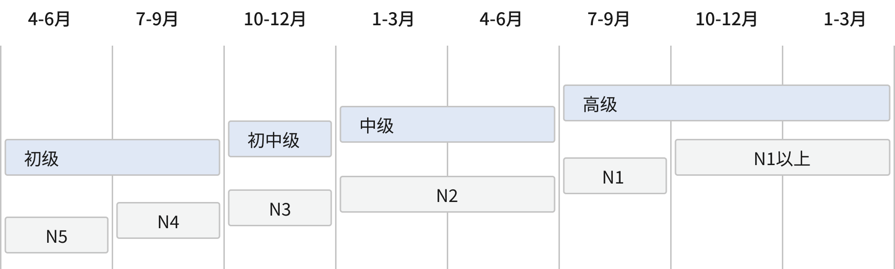 在千驮谷,我们将根据学生日语水平大致分为9个级别,同时考虑学习速度和学习方式等因素,会进行更细致的班级划分。因此,您可以轻松且高效地提升日语能力。此外,我们会根据测试和面试的结果定期调整班级,使学生始终能在适合自己的班级中学习。